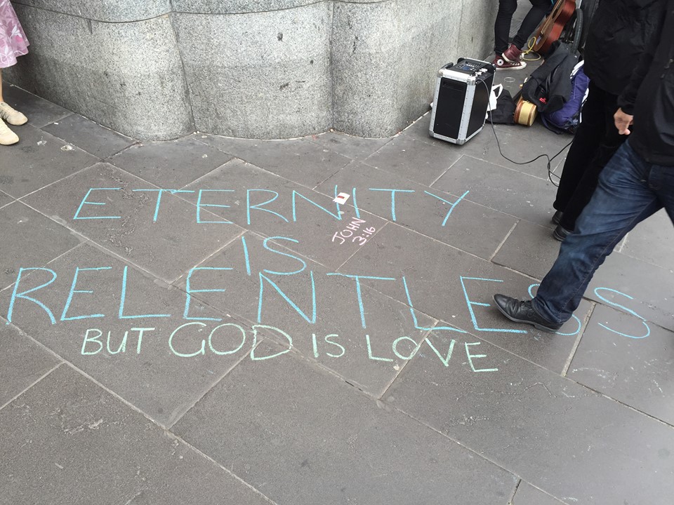 (I think perhaps my chalking the whole of John 3:16 on the footpath in huge letters didn’t help the situation.)